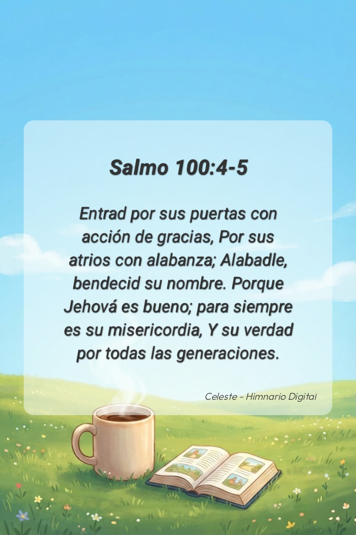 "Entrad por sus puertas con acción de gracias, Por sus atrios con alabanza; Alabadle, bendecid su nombre. Porque Jehová es bueno; para siempre es su misericordia, Y su verdad por todas las generaciones."