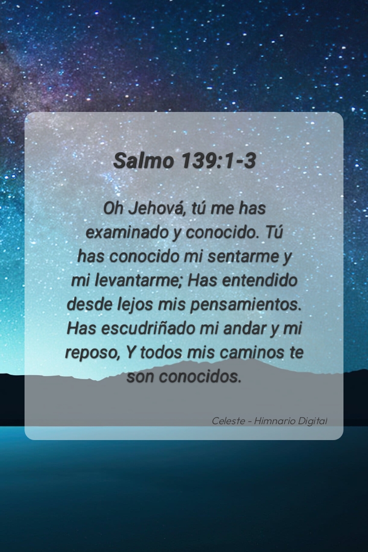 "Oh Jehová, tú me has examinado y conocido. Tú has conocido mi sentarme y mi levantarme; Has entendido desde lejos mis pensamientos. Has escudriñado mi andar y mi reposo, Y todos mis caminos te son conocidos."