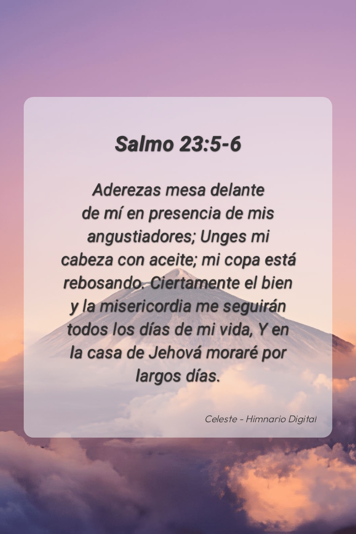 "Aderezas mesa delante de mí en presencia de mis angustiadores; Unges mi cabeza con aceite; mi copa está rebosando. Ciertamente el bien y la misericordia me seguirán todos los días de mi vida, Y en la casa de Jehová moraré por largos días."