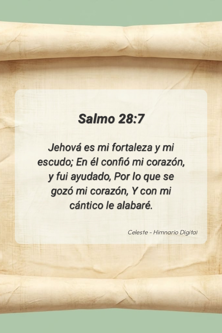 "Jehová es mi fortaleza y mi escudo; En él confió mi corazón, y fui ayudado, Por lo que se gozó mi corazón, Y con mi cántico le alabaré."