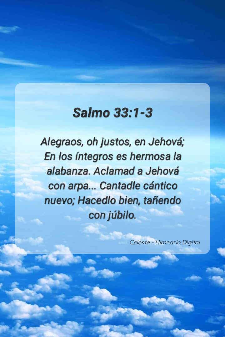 "Alegraos, oh justos, en Jehová; En los íntegros es hermosa la alabanza. Aclamad a Jehová con arpa... Cantadle cántico nuevo; Hacedlo bien, tañendo con júbilo."