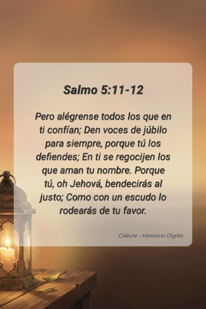 "Pero alégrense todos los que en ti confían; Den voces de júbilo para siempre, porque tú los defiendes; En ti se regocijen los que aman tu nombre. Porque tú, oh Jehová, bendecirás al justo; Como con un escudo lo rodearás de tu favor."