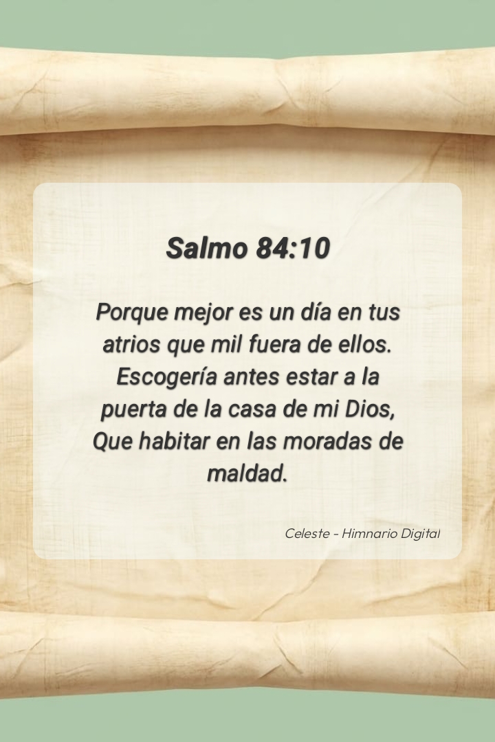 "Porque mejor es un día en tus atrios que mil fuera de ellos. Escogería antes estar a la puerta de la casa de mi Dios, Que habitar en las moradas de maldad."