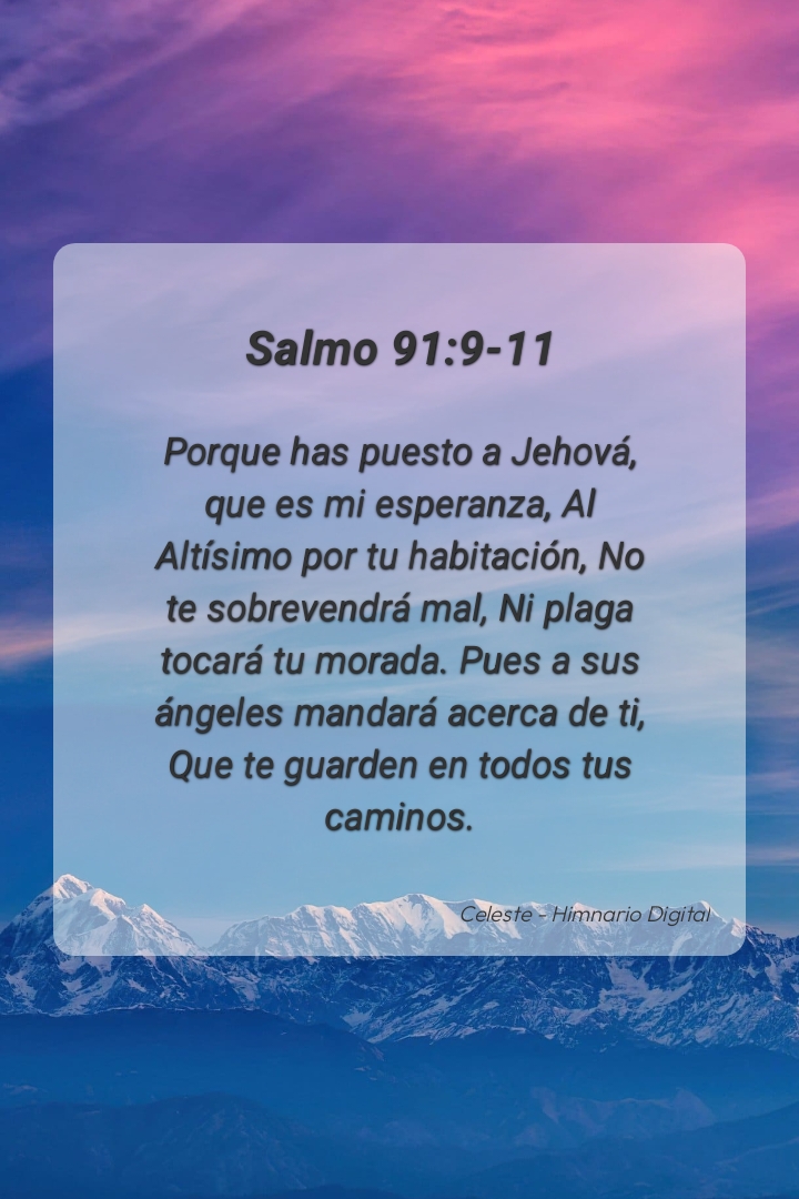 "Porque has puesto a Jehová, que es mi esperanza, Al Altísimo por tu habitación, No te sobrevendrá mal, Ni plaga tocará tu morada. Pues a sus ángeles mandará acerca de ti, Que te guarden en todos tus caminos."